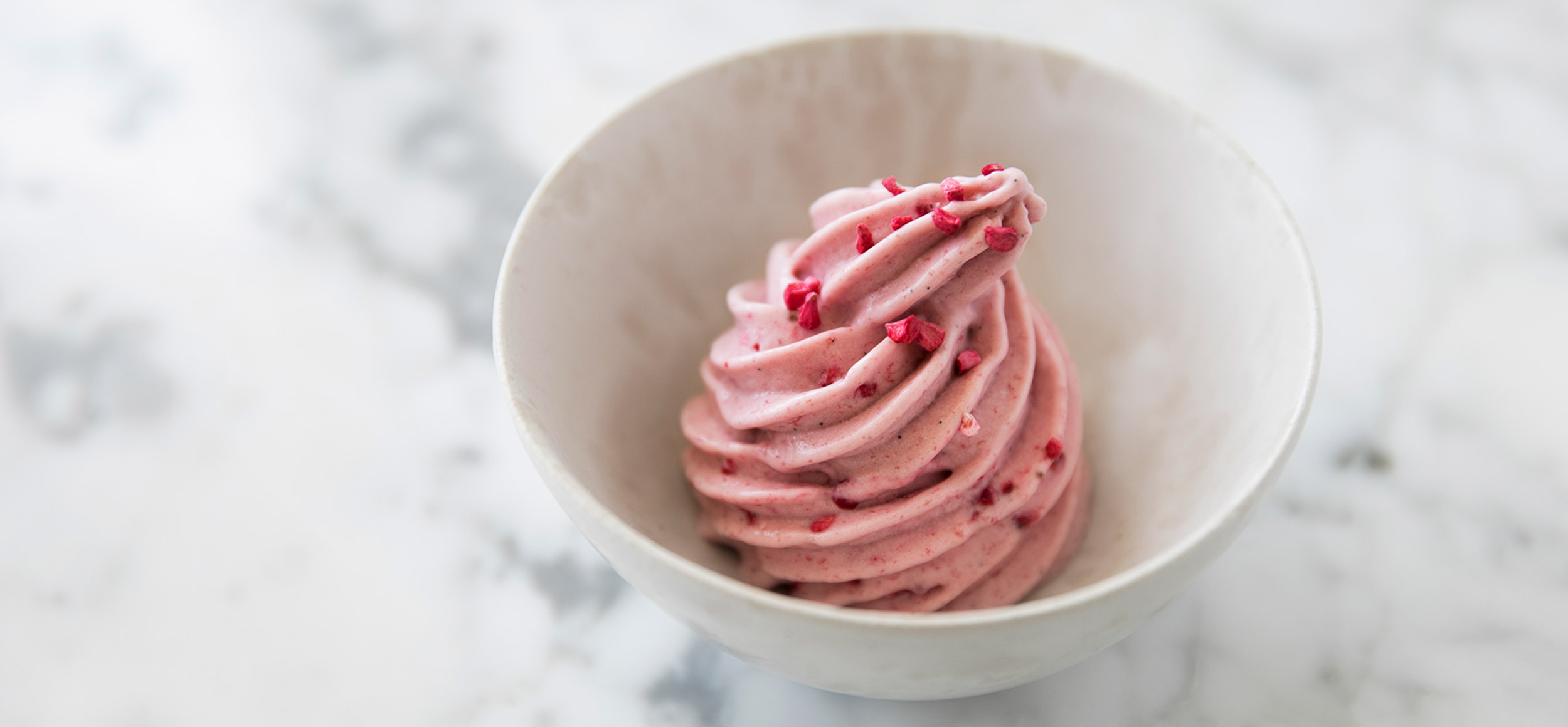 - Coupez la gousse de vanille dans le sens de la longueur et grattez l’intérieur pour prélever les grains. Ajoutez la gousse de vanille et les grains dans une casserole avec les framboises et faites cuire jusqu’à ce que les framboises soient cuites. Passez les framboises dans un chinois pour éliminer les pépins et obtenir une purée de framboises lisse. Pelez les bananes et passez-les au mixer avec le yaourt grec, la purée de framboises et l’Asssugrin Liquide.