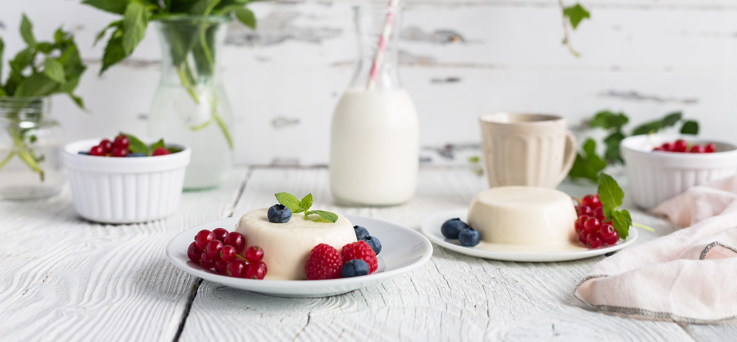 3. Servez les panna cottas surmontées de fruits frais et de menthe, saupoudrées d´un peu d´Assugrin ou servez accompagnées d´un coulis de fruit.